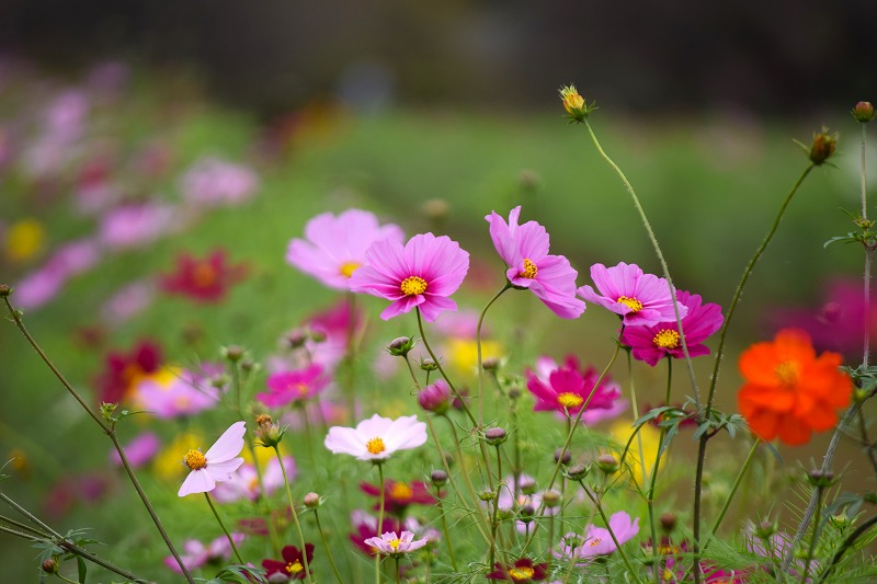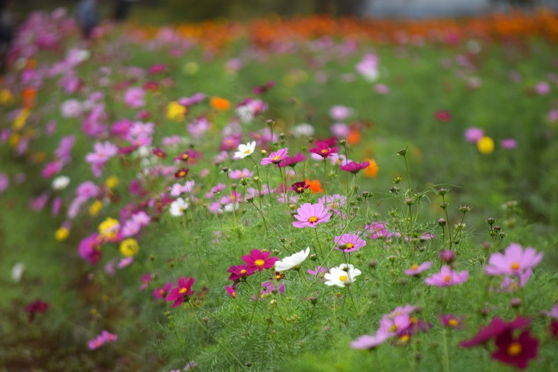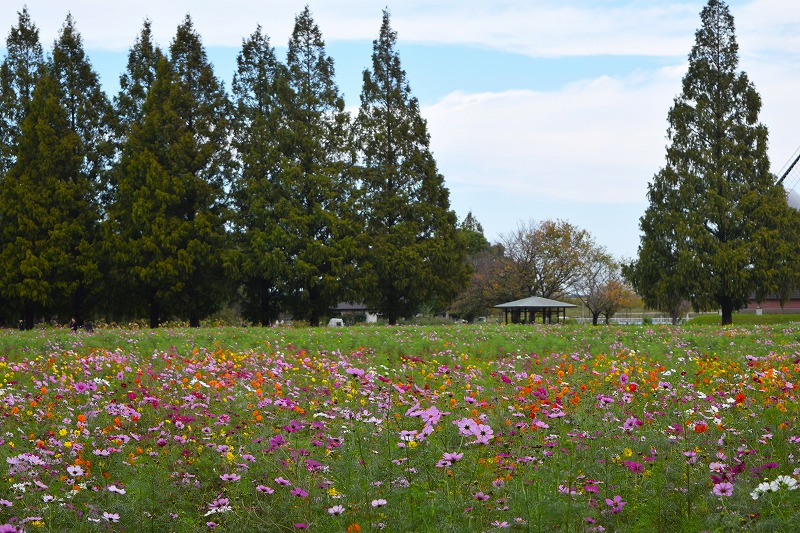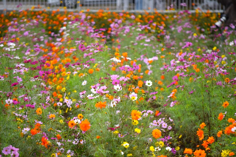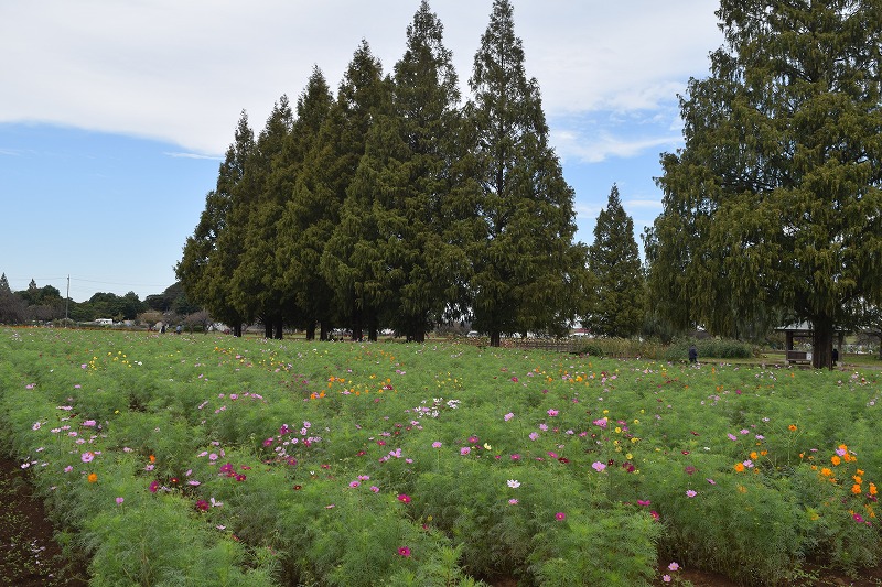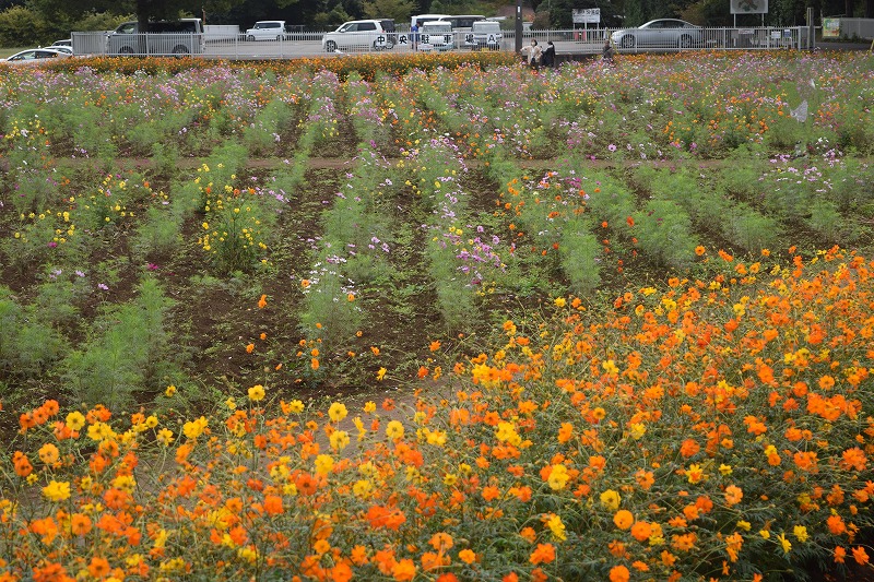 風車前花畑のコスモスの草丈は50~100㎝くらいになり、場所によっては花数が増えてきましたが、全体的にはまだ1割ほどの開花です。