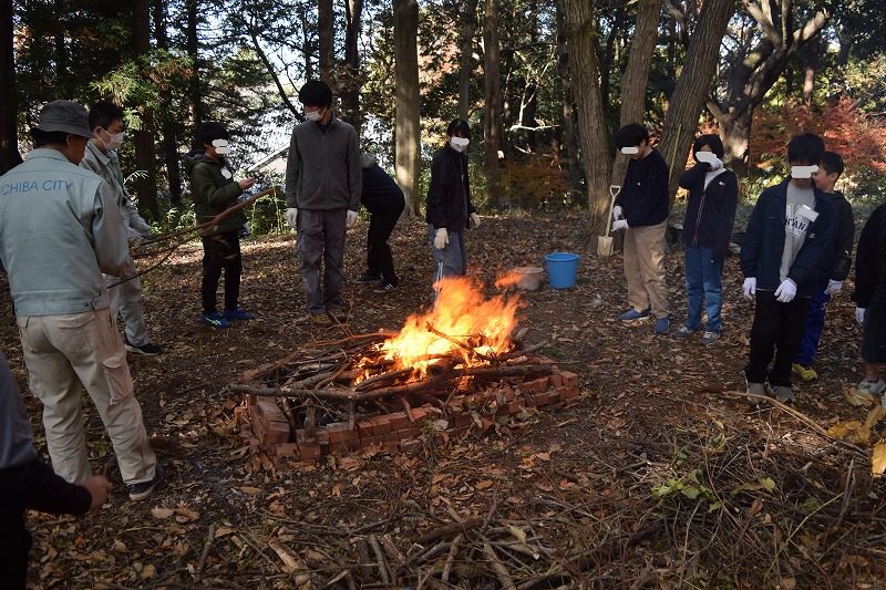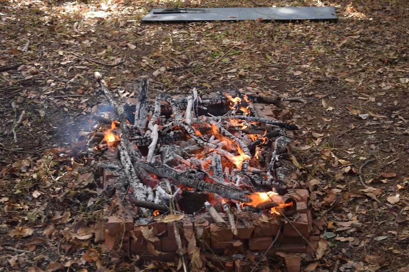 こちらも当時の作り方に習い、枝や葉を集めて火を焚きます。
