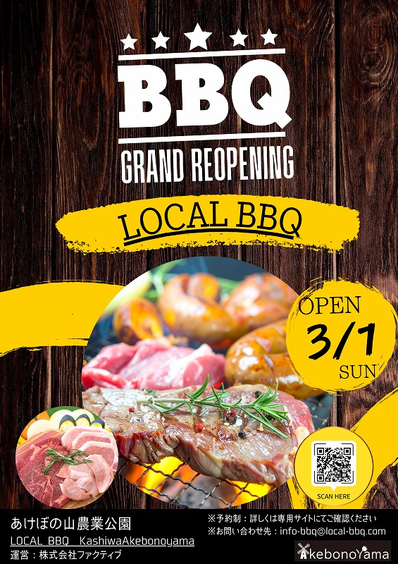 バーベキュー場が、「LOCAL BBQ(ローカルバーベキュー)柏あけぼの山農業公園」として、リニューアルオープンします。