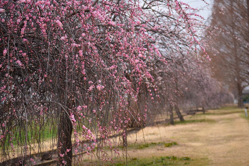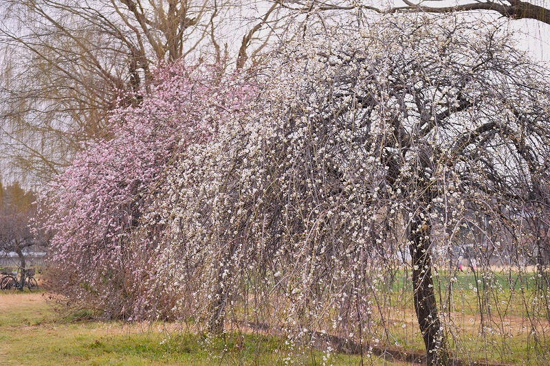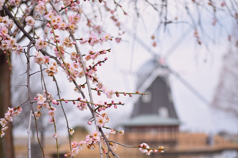 2026年02月16日 見ごろのお花 【ウメ開花状況】2026年2月16日 風車前花畑の横のせせらぎ沿いには10本の枝垂れ梅があります。品種によってはまだつぼみのものもありますが、だいぶ見頃になってきました。