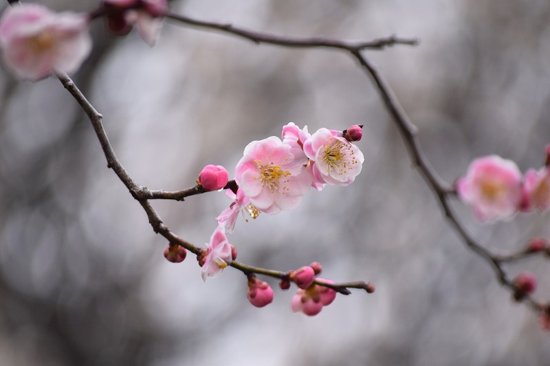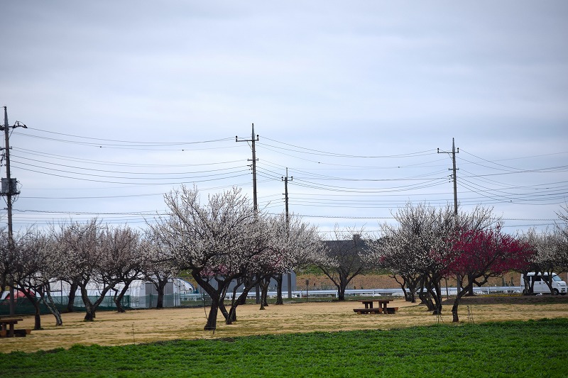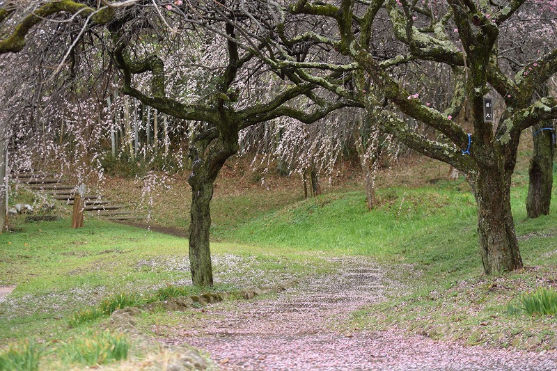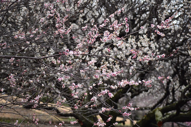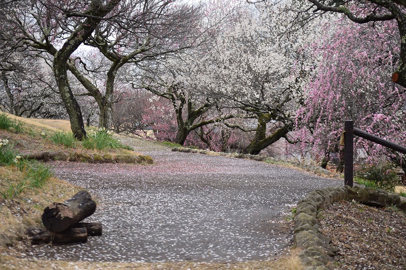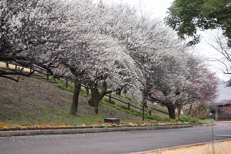 2026年02月26日 見ごろのお花 【ウメ開花状況】2026年2月26日 先週末の暖かさで一気に開花が進んで満開になったウメは、23日(月)の春一番と昨日の雨により花びらが落ち始めた品種もあります。 お花が終わってしまうさみしさもありますが、はらはらと舞い落ちる花びらや、白、ピンクに染められた梅園の園路もまたきれいでした。 遅咲き品種の「朱鷺の舞」、「滄溟の月」、「思いのまま」は見頃になっています。<朱鷺の舞 ときのまい> 風車前花畑せせらぎ沿いの枝垂れ梅 果樹園のウメも見頃になりました。