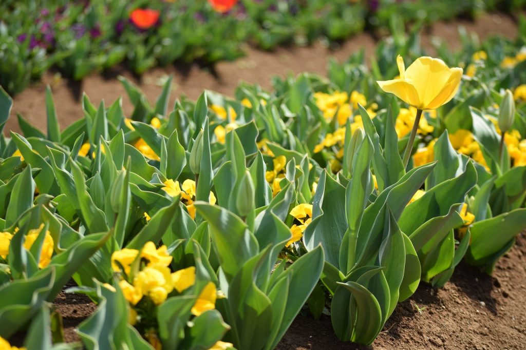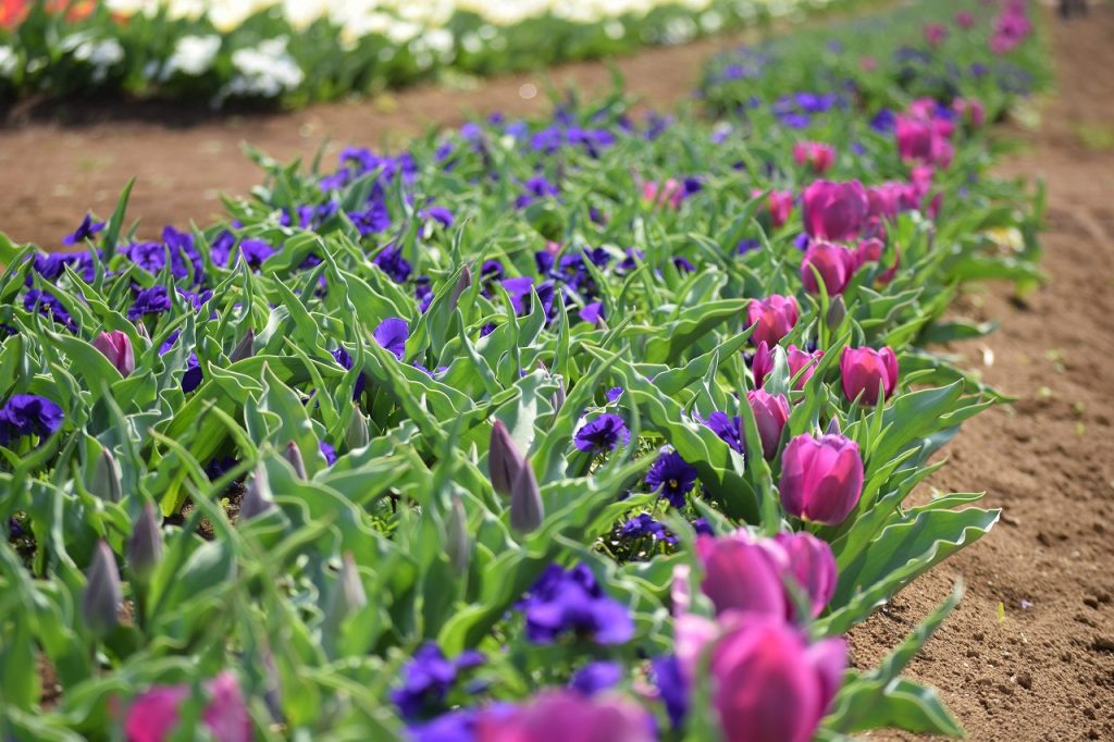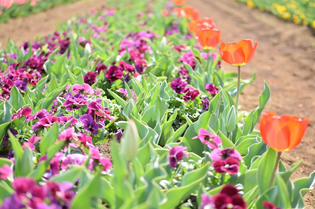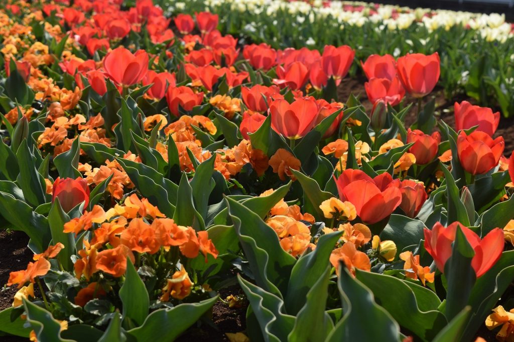2026年03月29日 見ごろのお花 【チューリップ開花状況】2026年3月29日 チューリップはところどころ咲き始めました。 白色は茎も伸び、4割ほど開花してきました。ピンク、オレンジは茎はまだ短いですが、3割ほど開花しています。 黄、赤、紫色は、ほとんどがつぼみです。